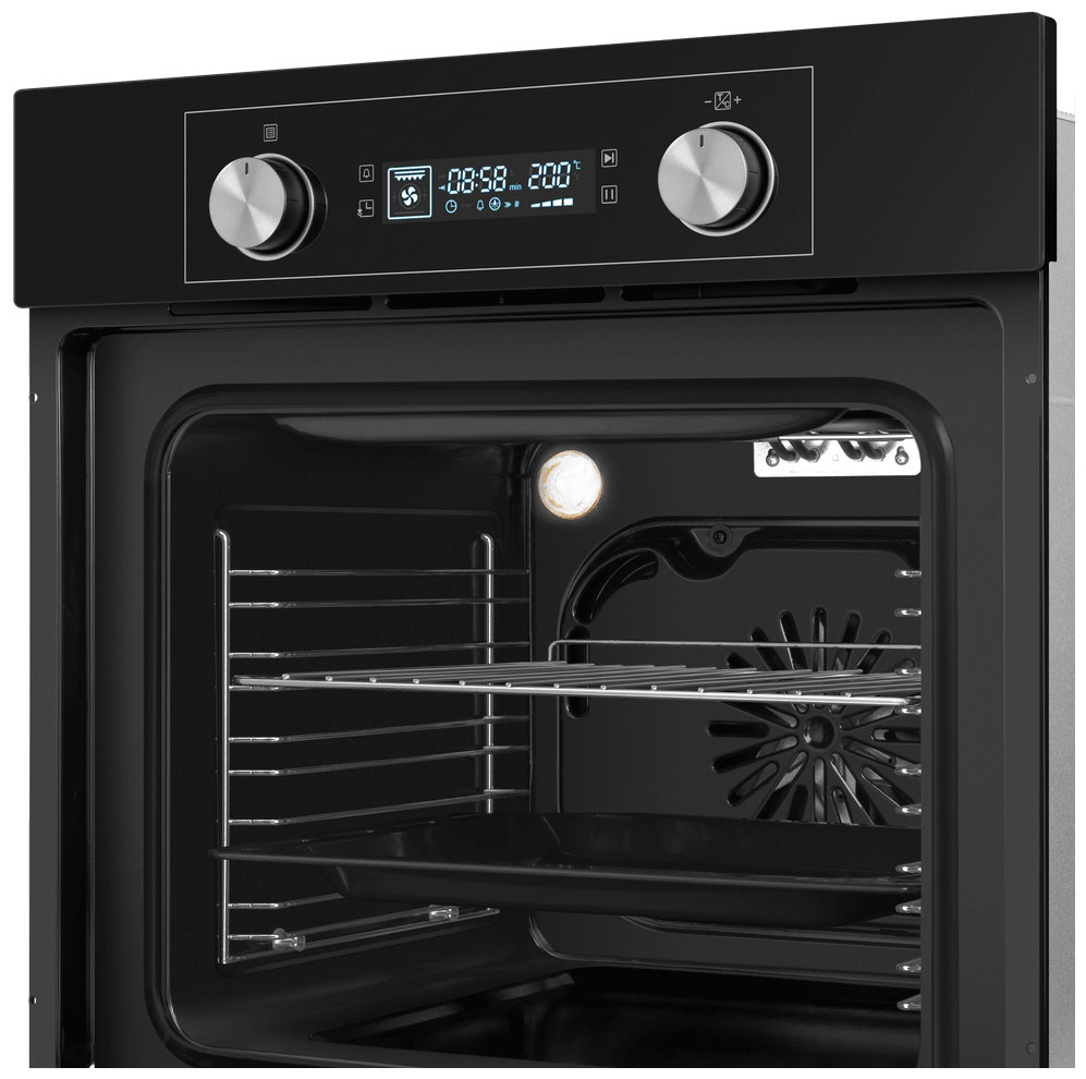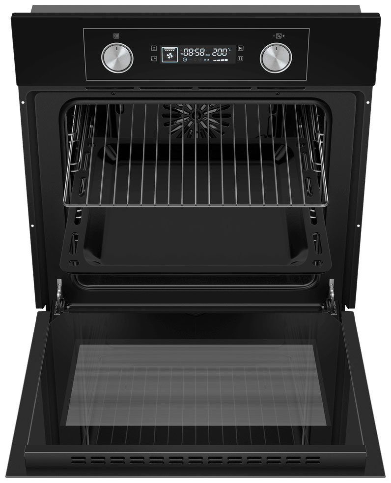 Большой объём 60 л. При таком объёме вы можете готовить одновременно несколько блюд, разместив решетку или противень на одном из 5 уровней боковых направляющих. Поворотные ручки PUSH PULL в сочетании с сенсорным управлением обеспечивают комфортное и наиболее точную регулировку параметров приготовления. Большой цифровой дисплей духового шкафа отображает всю необходимую информацию. Класс энергопотребления А - это гарантия эффективности устройства при минимальном расходе электроэнергии. Вы можете больше не думать о счетах за электроэнергию, а только наслаждаться приготовлением вкуснейших блюд в нашем духовом шкафу. Благодаря конвекции вы можете установить противень на любом уровне и получить равномерное пропекание, хрустящую корочку. Тепло распределяется по всему объёму духового шкафа, обеспечивая равномерное приготовление блюд.