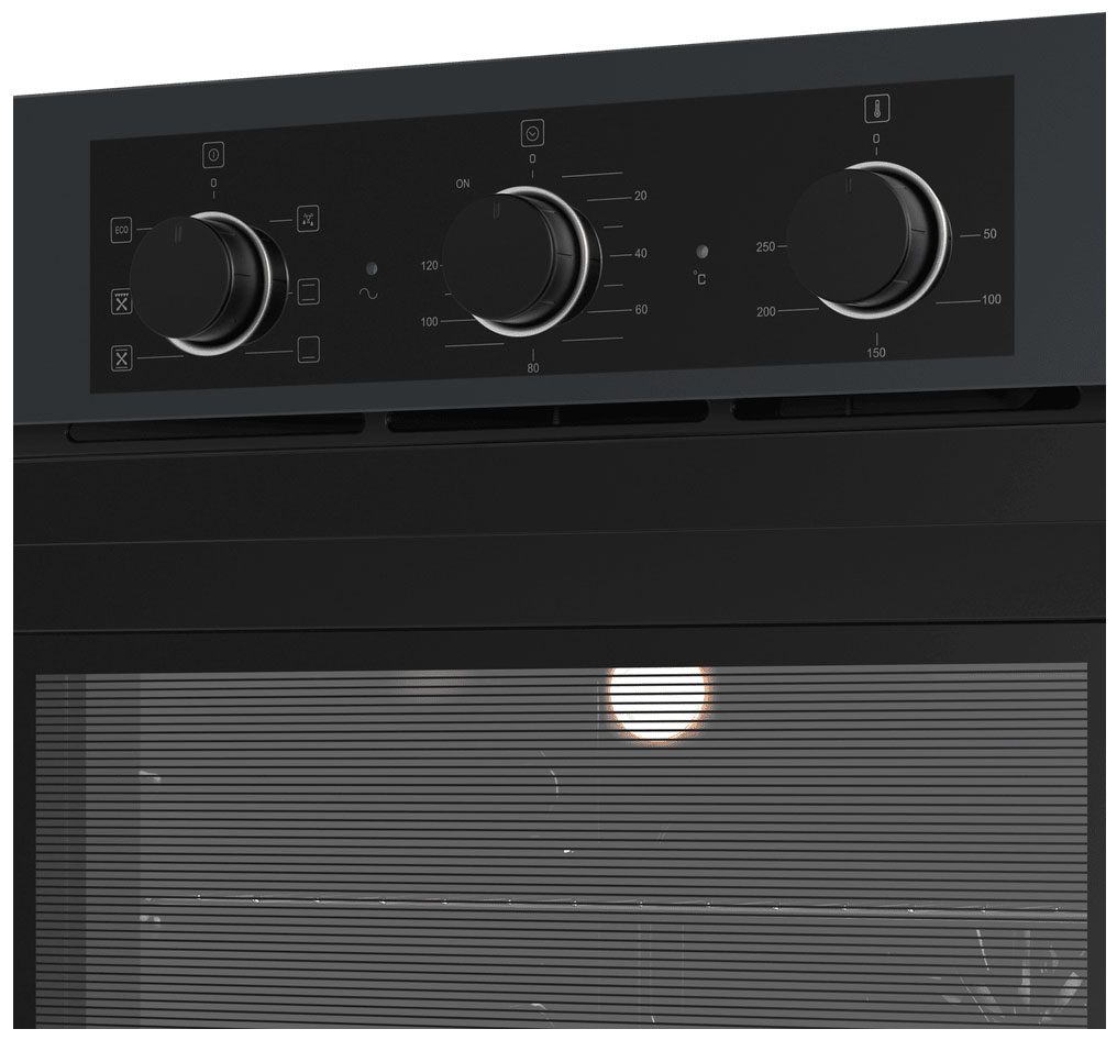 Набор программ несколько превышает минимум: кроме верхнего и нижнего нагрева, работы верхнего ТЭНа и гриля можно использовать конвекционную циркуляцию горячего воздуха и режим интенсивного жарения. Есть комбинированный режим гриль + конвекция, экономичный ECO-режим для контроля потребления энергии. Вместительность камеры — 59 литров, внутри доступно пять уровней размещения форм и противней, что удобно при одновременном приготовлении нескольких блюд.