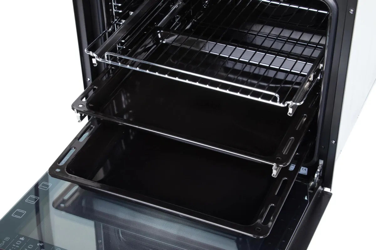 Модель выполнена в черном цвете. В комплект к духовому шкафу прилагаются металлическая решетка, глубокий противень и решетка для гриля.