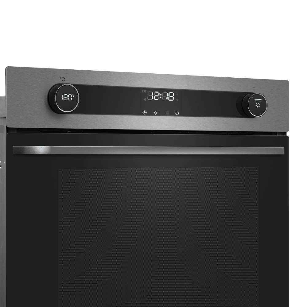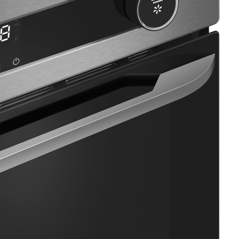 Независимая электрическая духовка в корпусе из нержавеющей стали сочетает стильный внешний вид и продуманную эргономику. Передняя панель выполнена в металлическом оттенке с комбинированной фурнитурой из нержавеющей стали, трёхслойной стеклянной дверцей. На верхней панели управления находятся два поворотных регулятора с оригинальной подсветкой для выбора режима работы и температуры, а между ними дисплей с часами и таймером в сочетании с сенсорными кнопками TouchControl. Внутренняя камера объёмом 76 л предоставляет простор для больших противней и размещения нескольких блюд одновременно, а освещение упрощает визуальный контроль без открытия дверцы.