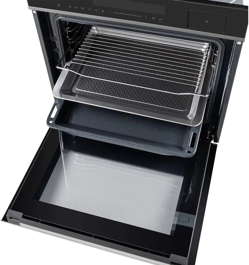 Модель выполнена в черном цвете. В комплект к духовому шкафу прилагаются металлическая решетка, глубокий и плоский противни, а также термощуп для мяса.