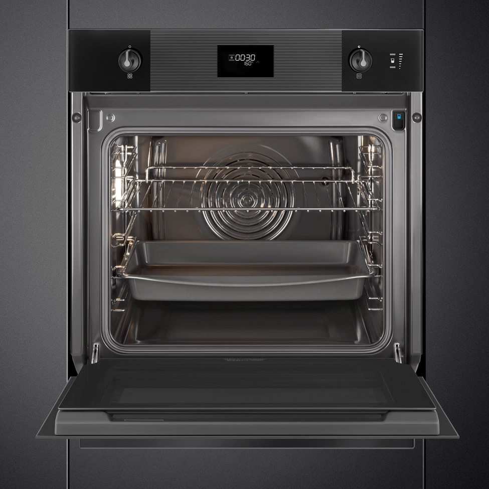 Духовой шкаф Smeg SO6101S2B3 оснащен сенсорным дисплеем, на нем отображается время таймера, также имеется 2 поворотных регулятора. Имеются 11 режимов нагрева среди них, есть размораживание по времени время для разморозки определяется автоматически. Система очистки происходит с помощью пара в специальный отсек объемом 0.8 л. наливается вода.