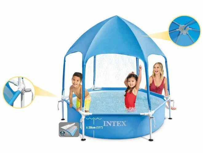 Подарите прохладу и защиту ваших малышей от солнца с помощью нового бассейна Canopy Metal Frame 183х38см с навесом. Верхний навес с затемнением UPF 50+ обеспечивает устойчивость к сильным ультрафиолетовым лучам, безопасность и удобство вашему ребенку.