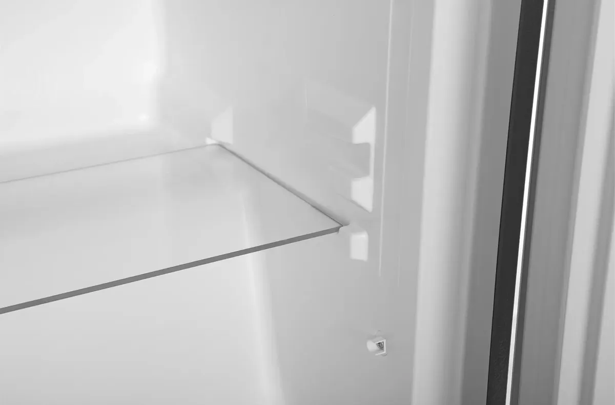 Внешнее покрытие корпуса выполнено из серебристого металла. Благодаря этому холодильник с морозильником Hyundai CC3091LIX надолго сохранит свой первозданный внешний вид и не будет огорчать вас случайно поставленными царапинами. Полки внутри верхней камеры выполнены из закаленного стекла.