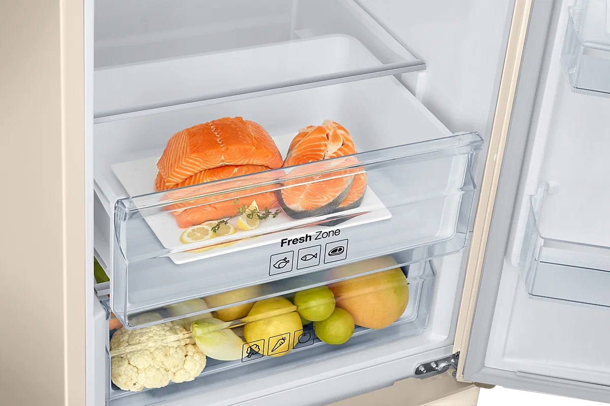 Оснащение холодильного отделения включает три стеклянные полки, две из которых переставляются по высоте, шесть дверных карманов и два контейнера, один из которых —зона свежести для хранения фруктов и овощей. Яркое освещение обеспечивает LED-лампа. Более качественному охлаждению способствует металлическая панель Metal Cooling, расположенная на задней стенке. Морозильное отделение оборудовано тремя выдвижными ящиками и лотком для льда. Мощность замораживания составляет 12 кг в сутки.