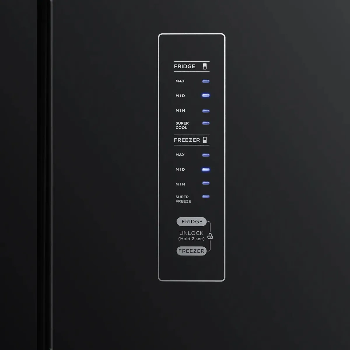 Настройка режимов работы холодильника и морозильной камеры осуществляется нажатием сенсорных кнопок на внешней стороне дверцы холодильника, где расположен информативный дисплей с панелью управления.