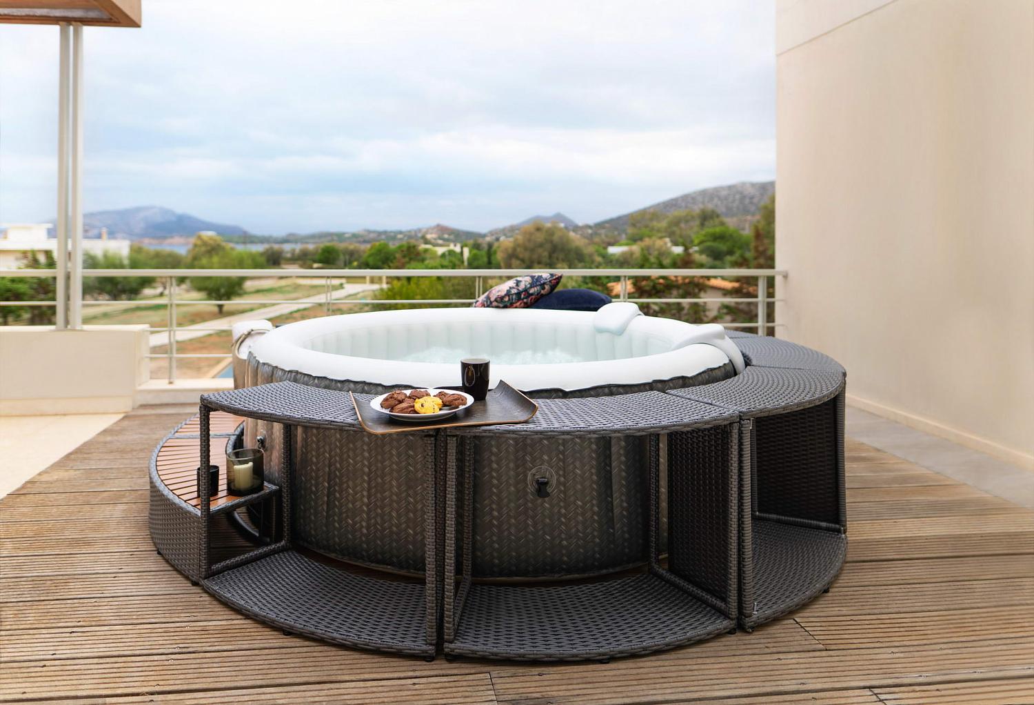 MSPA COMFORT Ottoman Round Bubble Spa – отличный выбор для домашнего СПА-бассейна, подходит для использования как на открытом воздухе, так и в помещении. Вместимость до 6 человек. Корпус (чаша) бассейна из плотного прочного многослойного ПВХ с внутренним антибактериальным покрытием, дно с антискользящей защитой. Чаша обладает устойчивостью к проколам и разрывам. Дизайн стенок в современном роскошном стиле, наружная отделка под ротанг.