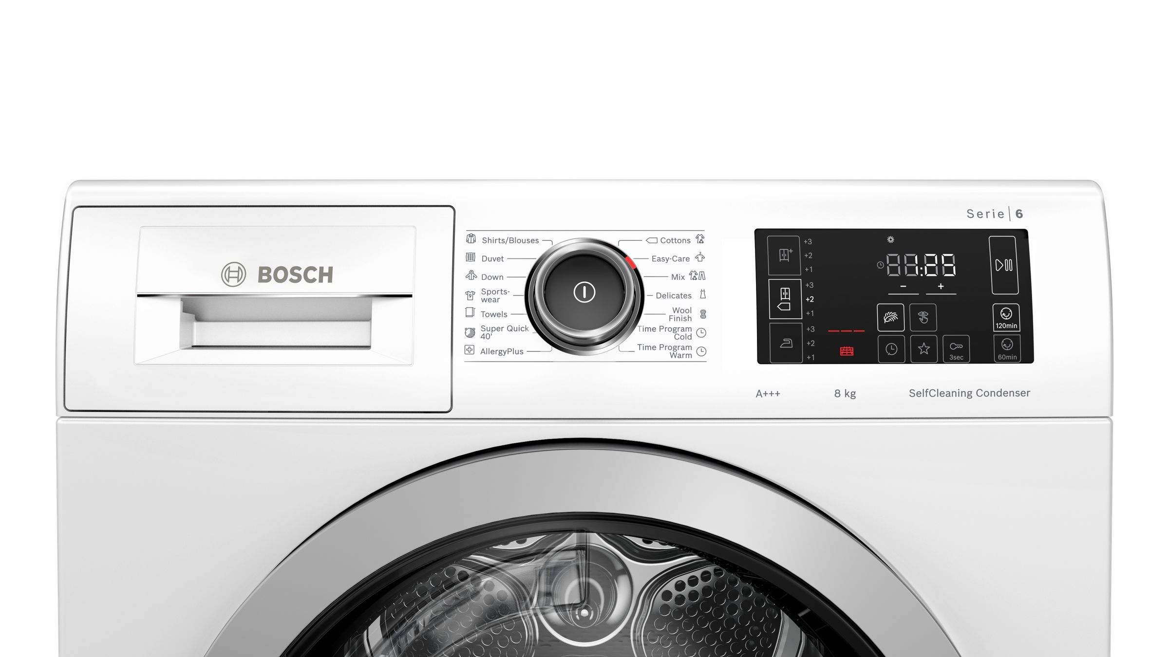 Электронное управление удобно и понятно для людей разного поколения. Контролировать процесс можно с помощью дисплея, на который выводится основная информация. В вашем распоряжении индикаторы: времени до окончания программы, заполнения емкости для конденсата/необходимости опорожнения резервуара, заполнения ворсового фильтра/необходимости смены фильтра. Вы можете использовать таймер, чтобы отложить запуск на подходящее время. Когда машинка прекратит работу, вы услышите специальный сигнал.