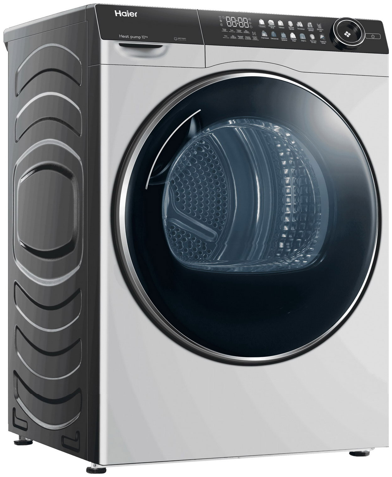 Серебристая модель Haier HD100-A2378S оборудована лучшими технологиями для сушильных машин.Непревзойденная вместительность до 10 кг при стандартных размерах корпуса.Сушка с помощью теплового насоса — экологичная, экономичная, деликатная.Яркий светодиодный дисплей Color&Touch, который превращает машину в предмет искусства и облегчает настройки.14 интеллектуальных программ для хлопка, детской одежды, деликатных тканей и других вещей, а также уникальные режимы «Подогрева одежды» и «Быстрой сушки» за 30 минут.Объемные предметы и самые требовательные ткани можно зафиксировать на складной полке. Ее размер увеличен до 34×51 см в глубину и ширину — это больше, чем у других моделей, и позволяет сушить даже объемные вещи в один слой.Реверс барабана обеспечит равномерный обдув теплым воздухом и предотвратит появление складок, а три режима сушки помогут регулировать остаточную влажность одежды по вашему усмотрению. Модель подарит максимальный комфорт не только во время использования, но и при монтаже: дверца Haier HD100-A2378S навешивается в любую сторону, отвод конденсата можно настроить в контейнер или в канализацию.
