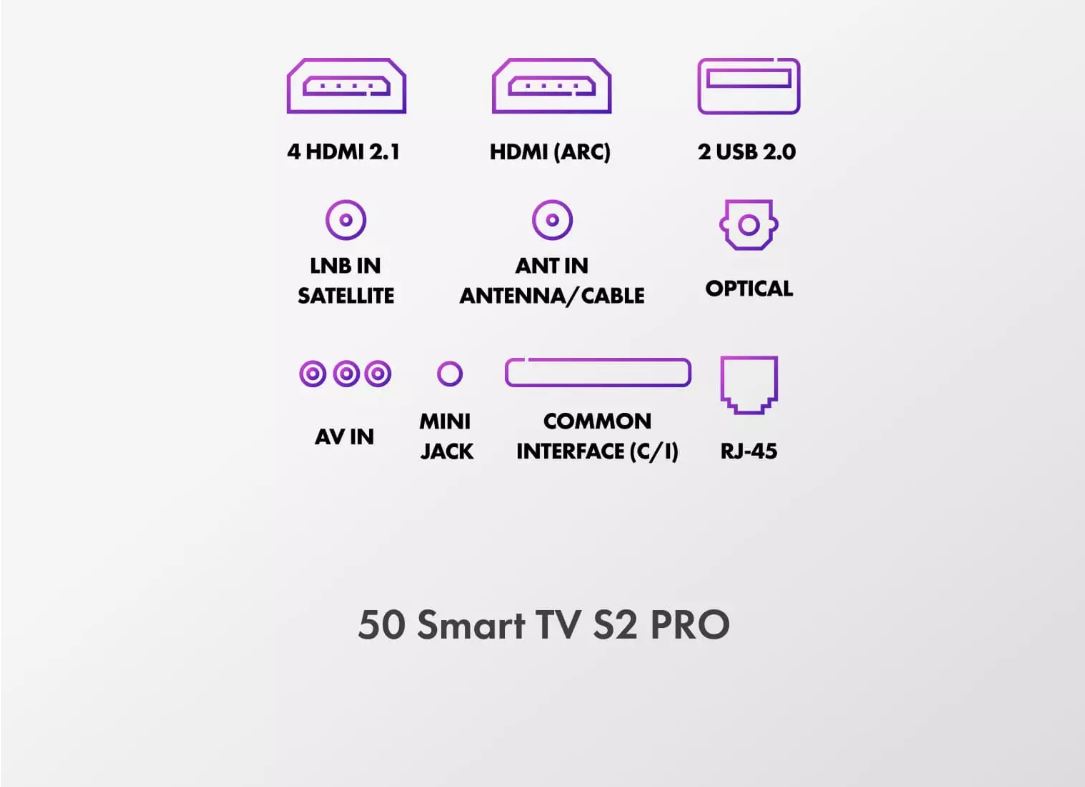 Есть много разъёмов: четыре HDMI 2.1, два USB 2.0, RJ-45 (Ethernet), S/PDIF оптический, композитный видео-, стереоаудио, CI+/PCMCIA и разъём для наушников. Встроенный блок питания упрощает установку, а класс энергоэффективности A снижает потребление энергии.
