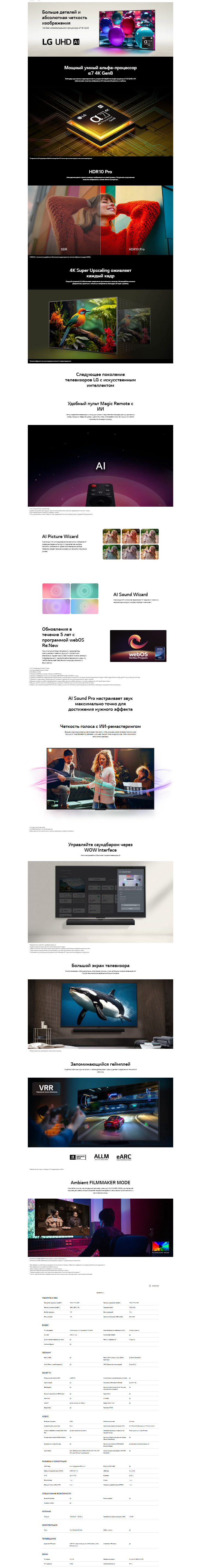 Телевизор работает на операционной системе webOS, которая позволяет легко находить приложения, стриминговые сервисы и управлять настройками. Встроенные функции умной оптимизации улучшают изображение и звук, а режим FILMMAKER MODE™ воспроизводит фильмы в оригинальном качестве режиссёра, без искажений.