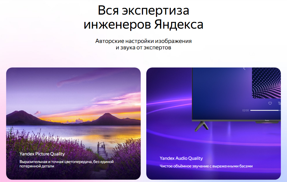 Широкополосные динамики специально настроены и сбалансированы по технологии Yandex Audio Quality. Широкий частотный диапазон и чёткий бас обеспечивают великолепные впечатления не только в фильмах, но и при прослушивании музыки.