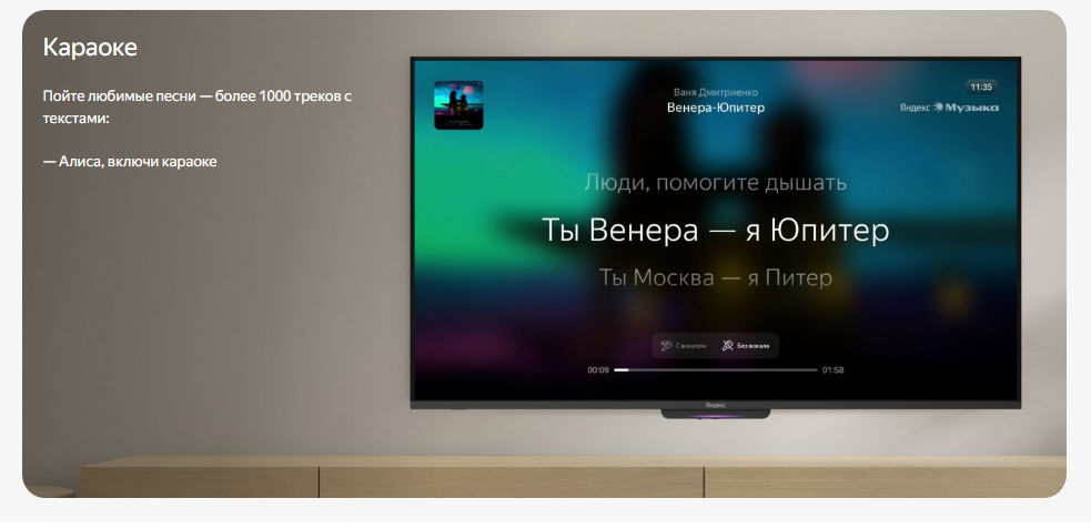 Выбирайте контент, управляйте громкостью и переключайте каналы голосом без пульта. Алиса услышит и распознает команду благодаря чувствительным микрофонам и функции Farfield.