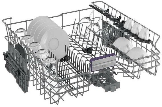 Модель оборудована внутренним баком из нержавеющей стали, который вмещает в себя до 15 комплектов посуды. Расход воды за один цикл мойки не превышает 9,5 л. С помощью таймера отложенного старта в пределах 24 часов предусматривается возможность назначать нужное время начала мойки посуды. Для монтажа модели необходима ниша размером 870х600х570 мм. Уровень шума во время работы не превышает 44 дБ.